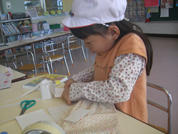 翌日今度は、佑月君がサイコロ作りをしていた。佑月君の作り方は、4人の作り方と全く違い色画用紙を正四角形の6枚切り、(