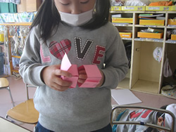 3人が一生懸命サイコロ作りをしていると、優心が、「ねえ、何してるの?」と聞いてきた。「サイコロ作ってるんだよ。」と、侑夏と奈穂が答えた。「あたしもやっていい?」「いいよ。」3人は、夢中でサイコロ作りをしているので、優心には言葉だけで返事をしていた。優心がサイコロ作りを始めようとしていたが、3人が使っていたマス目の入った厚紙は既に1枚もなかった。優心は、どうするのだろう?と思っていると、優心は、ピンクの色画用紙を持ってきた。この色画用紙をどのように使っていくんだろうと、興味深く見ていると、優心は、紙を5列に蛇腹折りにしていった。そして、その1列を均等に5個に区切っていた。