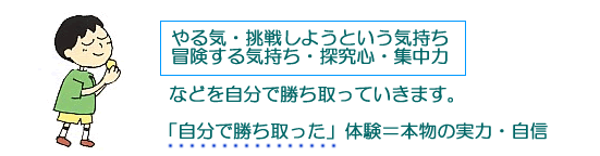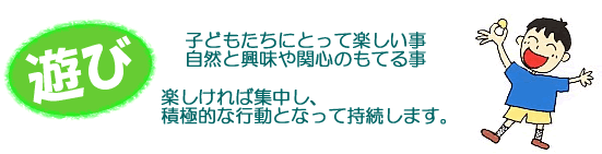 楽しめ・工夫し・疑問をもち・努力したりできる遊びの場が必要です。 また、課題のある活動の合い間の時間では、 自分で考え、工夫し・行動を深めることはできません。 じっくり好きなことに取り組める状況を作ってあげる事が大切です。