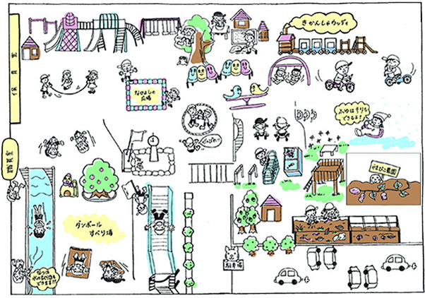 アドベンチャー・ランド | なかよし広場 | じてんしゃのり場 | きかんしゃウッディ | しぜんの森 | すべり台・ダンボールすべり場 シーソー | ブランコ | 水のすべり台 | 恐竜滑り台 | やまびこ農園