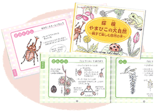 「探検やまびこの大自然」は、やまびこ幼稚園で見ることができる自然の植物やどうぶつ、昆虫などについて子供向けにまとめた図鑑です。手書きイラストに色鉛筆で色づけしたきれいで楽しい読み物です。草花での遊び方や、昆虫の飼い方など、すぐに子どもが生活の中で活用できるように工夫しています。